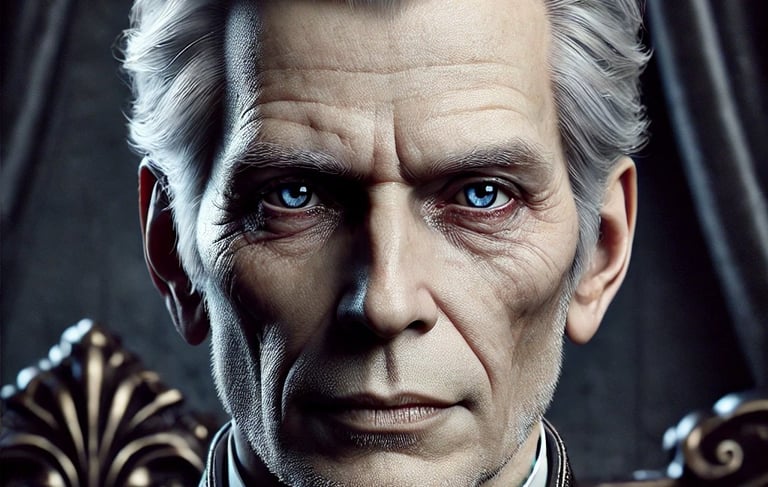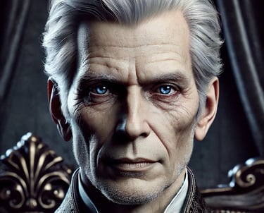 Aparência: Um homem de pele clara, cabelos grisalhos bem penteados, com trajes que exalam autoridade e requinte. Seus olhos azuis profundos demonstram sabedoria e poder.