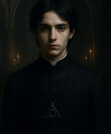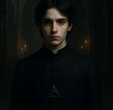 Veste-se com batina simples, e sempre carrega um livro de couro negro fechado com três fechos de ossos.